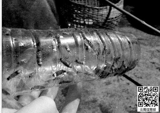 两米的长竹竿,套一个白色纱兜,这就是村民们的捕萤工具。村民们将虫子分装在透明塑料瓶内,里面放上绿叶,喷入保持萤火虫生命的营养液,在固定的收购点卖给“虫头”。