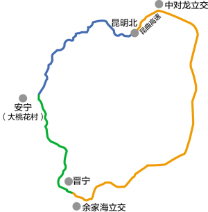 起于昆曲高速中对龙立交,连接空港、嵩明、宜良、澄江、晋宁五个县(区),终止于昆玉高速余家海立交