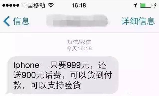 诈骗手段:骗子通过电话、短信、微信、网页等方式发布虚假广告,自称有“特殊进货渠道”,可以低价购买苹果手机,或以商家、客服的名义,宣称可以利用某平台积分获得低价购机的机会,同时利用货到付款的方式提高可信度。事实上,很多急于购买苹果手机的朋友,在盲目相信并交付一定数额的定金后,往往就和假销售商失去联系了;或者可能只会收到一部山寨、高仿苹果手机。
