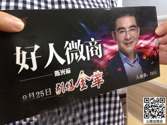 据了解,陈光标此行是为自家膳食减肥产品代言,发布会在金华市文化中心最大的一个会场举行。记者现场联系微商团队购买门票才得以进场。该团队表示,“外人”想要进场,得购买他们的减肥产品,750元一盒,以此换一张门票。