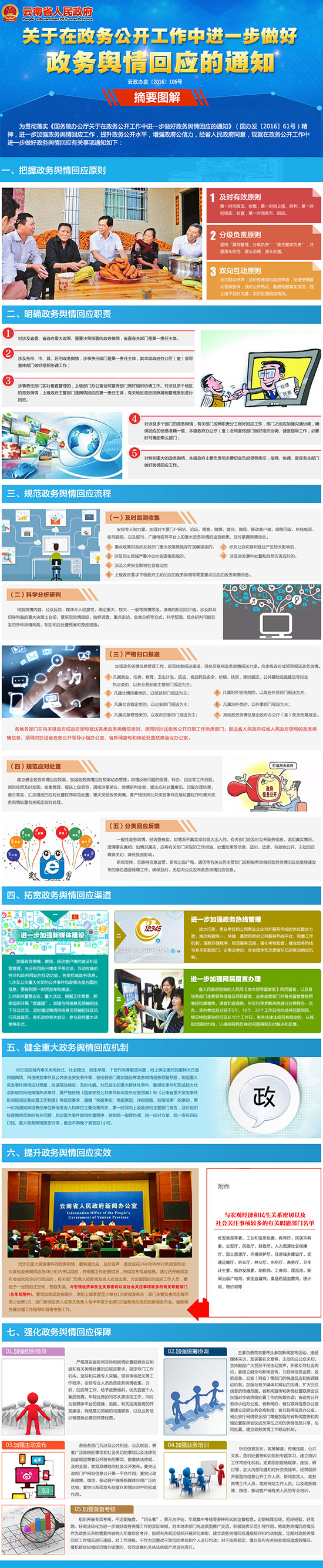 《通知》要求,建立健全重大政务舆情处置机制,根据性质和影响范围,实行分类分级分层处置和引导回应。对行政区域内事关用地拆迁、社会稳定、民生举措、干部作风等敏感问题,网上舆论激烈的重特大负面网络舆情、网络突发事件及公共安全突发事件等,各地各部门要加强日常政务舆情信息预警预报,制定重大突发事件舆情应对预案,快速高效响应,及时化解。对已发生的重大群体性事件、敏感性事件和形成较大社会影响的网络舆情热点事件,要严格按照有关规定要求,第一时间通知舆情责任单位新闻发言人和单位主要负责同志,第一时间向上级政府和主管部门报告,及时组织核查舆情反映的有关问题,启动重大事件舆情处置程序,做到统一指挥协调、统一应对方案、统一发布回应口径。重大政务舆情报告时限,最迟不得晚于事发后1小时。对监测发现的政务舆情,各地各部门要加强研判,分类处理,及时采取发布权威信息、组织专家解读、召开新闻发布会或吹风会、接受媒体专访等方式,多角度回应,全方位引导。