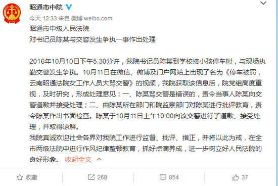 10月11日,微信、微博及门户网站上出现了名为《停车被罚,云南昭通法院女工作人员大骂交警》的视频,昭通中院获取该信息后,院党组高度重视,及时研究,形成处理意见:一、陈某骂交警是错误的,责令当事人陈某向交警道歉并接受处理;二、由陈某所在部门和院监察部门对陈某进行批评教育,责令陈某作出书面检查。
