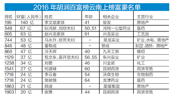 在云南地区,共有13人上榜,其中俊发李文斌家族以140亿元第二次成云南地区首富。