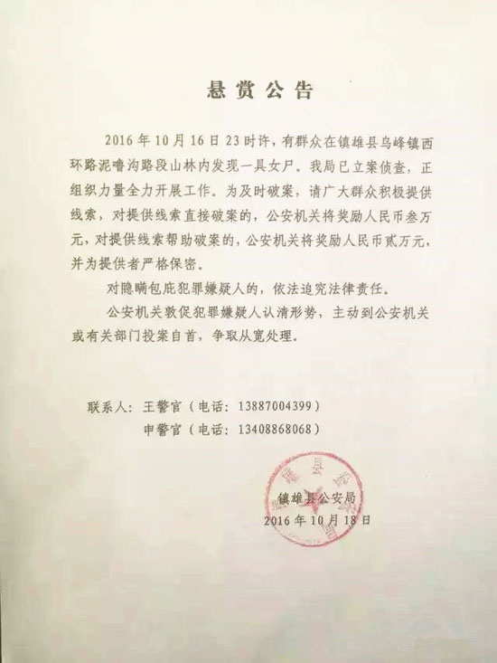 10月18日, 镇雄县公安局发布悬赏公告,请广大群众积极提供线索,协助公安机关早日破案。同时敦促犯罪嫌疑人早日到公安机关投案自首,争取从宽处理。