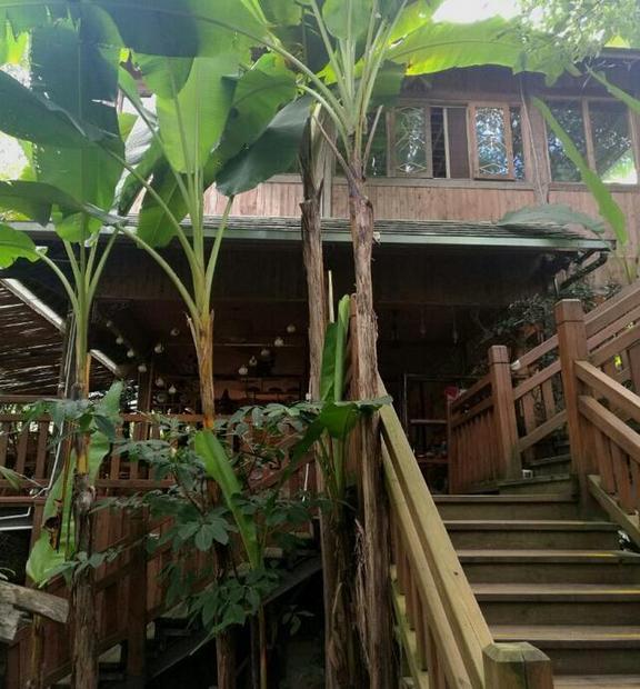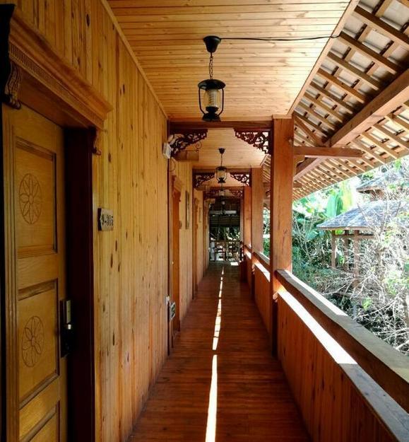 前厅、餐厅、茶室、客房,错落分布在绿荫丛中,被这样的木质栈道紧凑而有序地连接在一起,顺着木栈道,可以到达山庄所有的功能区域。长长的客房通道。山庄所有房屋都是木质结构,保持着布朗族杆栏式建筑的基本特征。