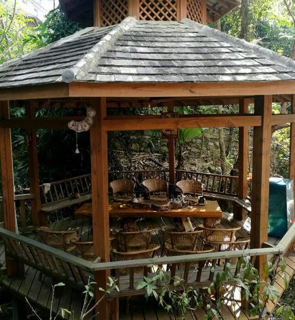 这个座位与众不同,像国王的宝座。这就对了,山庄主人南康先生,是末代布朗族一号头人阿里亚的孙子,也算布朗族最后的王子吧,新中国成立时期有一张毛主席与布朗族二号头人苏里亚握手的照片,而苏里亚,就是南康的舅爷。