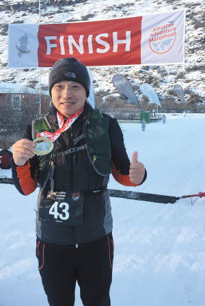 为了能获得这块格陵兰北极圈马拉松的奖牌,金飞豹可谓拼尽了全力,“42.195公里的赛道上没有观众和拉拉队,每5公里设一个补给站,仅有保温壶里的温水。因为赛道环境恶劣,跑过风口时感觉风快把人吹上天,事先听说每个补给站都会有温水和能量食品,我为了减轻负担没携带补充体能的能量食品,因为气温寒冷,体能消耗较大,才跑了15公里就腹中空空,跑过20公里的补给站时已是饥肠辘辘,好不容易跑到25公里的补给站,终于吃到了世界上最难吃的能量食品,但我还是把它当成最美味的美食吃了下去。”金飞豹回忆起来脸上是又幸福又痛苦的表情。