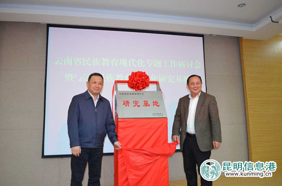 郑毅和杜俊军为“云南民族教育现代化研究基地”揭牌,并分别在会上发表讲话,云南省教育厅民族教育处处长董一凡宣读云南省教育厅成立“云南民族教育现代化研究基地”批复文件。