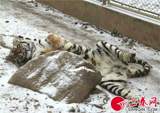 这么冷的天气,秦岭脚下动物园里的老虎都失去了平时的威风,像一只大猫似的倒躺在地摆出求抚摸求抱抱的造型。
