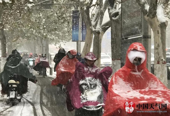 郑州一大早就大雪纷飞,一片银装素裹的景象,行人都裹上羽绒服,正值上班高峰期,行人无暇欣赏美景,骑电单车的人们全副武装,在雪地里艰难前行。