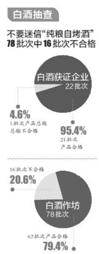 此次全市共抽检84个酿造白酒生产单位的100个批次产品,其中小作坊生产的白酒不合格比例非常高,而且17个不合格样品的总酸都不合格。