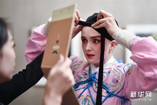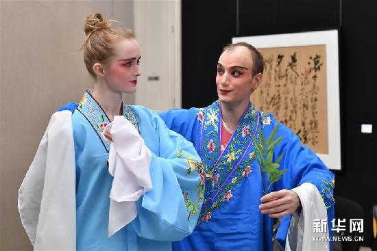11月28日,第七届巴黎传统中国戏曲节在法国巴黎闭幕,来自法国的诺拉与来自瑞典的蒂莫西在汇报演出上表演了昆曲。第七届巴黎传统中国戏曲节21日开幕,由国内知名昆曲演员组成的代表团11月23日至11月28日在巴黎中国文化中心为当地的戏曲爱好者进行了为期一周的昆曲演示与教学。(记者陈益宸 图)