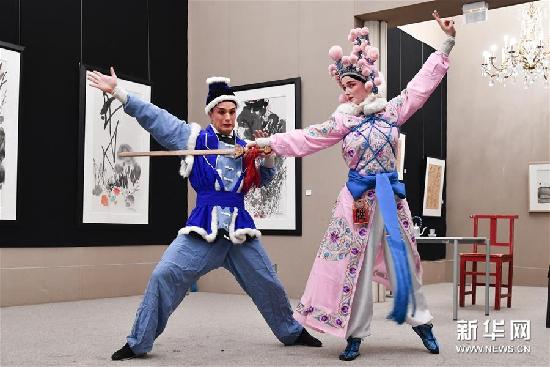 11月28日,在法国巴黎中国文化中心,蒂莫西(前)与诺拉在汇报演出上表演昆曲。