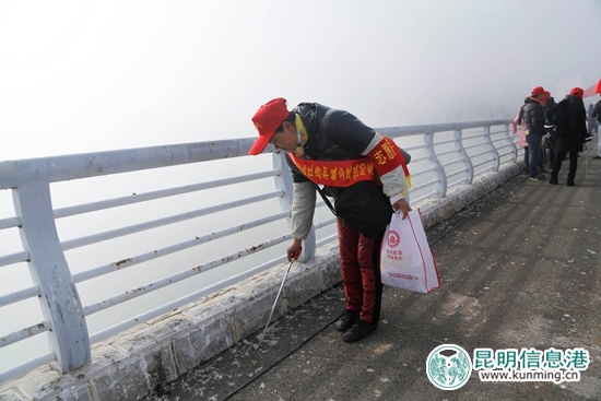 12月5日早上10时,“驻守”在滇池之滨的新川字闸笼罩在一片浓雾之中,冬日的寒风夹带着水汽刮在脸上更是湿冷。来自15家单位的150名志愿者早早等在桥上,十几面志愿者旗帜迎风飘扬。低温寒风丝毫没有影响志愿者们的干劲儿,简单的启动仪式后,大家很快行动起来,有的志愿者向过往行人发放保护滇池相关政策法规宣传册;有的则拿上清扫装备,捡拾、清扫河道两侧沿岸垃圾;还有的志愿者乘着打捞船在河面上打捞垃圾。
