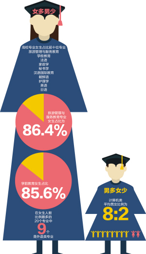 ●青岛高校的部分文科专业,男女比例高达1比8,中国海洋大学2014级英语专业研究生秦瑾晖说班里有26个人,只有3个男生,差不多10比1。
