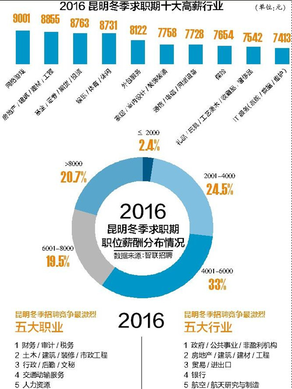 《2016年昆明冬季中国雇主需求与白领人才供给报告》数据显示,昆明地区2016年冬季求职期的企业平均招聘薪酬为税前6668元。