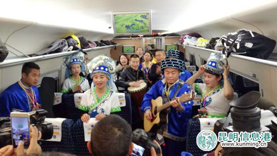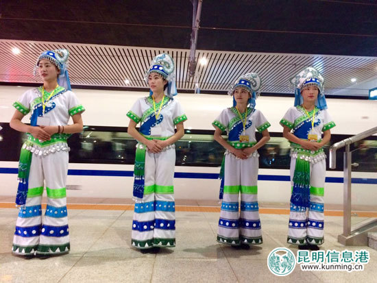 昆明信息港讯 记者上官艳君 1月6日上午8时11分,昆明南至深圳北G2924/1次——“曲靖号”高铁文化旅游列车在昆明南站首发。该趟“曲靖号”动车从昆明出发,途经贵阳、广州、深圳三个省市主要城市,全程近1500公里。昆明至深圳高铁开通以后,单程运行时间将由原来的29小时7分钟缩短至6小时52分钟,二等座车票554.5元,一等座票价778.5元。