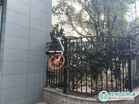 除乱停乱放外,部分共享单车还被挂在了墙壁上、树枝上和铁围栏上,有些竟然还被丢进垃圾桶里。工作人员称,这样的不文明现象时常发现,而且大多发生在晚上,很难找到“肇事者”,他们只得将车一辆辆取下并抬出步行街。
