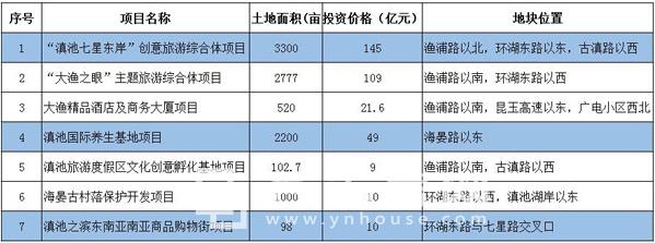 2016年12月下旬,昆明滇池国家旅游度假区再度发布了最新版本的招商项目手册,涉及重点招商引资项目7个,包括旅游文化产业和大健康产业。分别是“滇池七星东岸”创意旅游综合体项目(3300亩)、“大渔之眼”主题旅游综合体项目(2777亩)、大渔精品酒店及商务大厦项目(520亩)、滇池国际养生基地项目(2200亩)、滇池旅游度假区文化创意孵化基地项目(102.7亩)、海晏古村落保护开发项目(1000亩)。此外,另有滇池之滨东南亚南亚商品购物街项目(98亩)独立于招商项目手册,也对外统一招商。