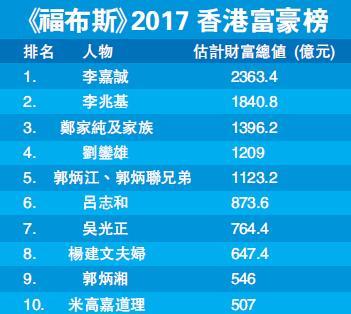《福布斯》2017香港富豪榜。图片来源于香港商报。