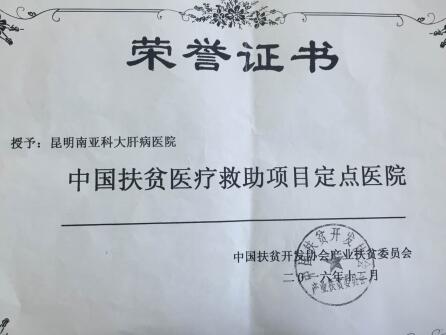 近日,昆明南亚科大肝病医院被委员会授予“中国扶贫医疗救助项目定点医院”,云南乃至全国贫困肝病患者可向“昆明南亚科大肝病医院医疗救助项目办公室”申请救助。