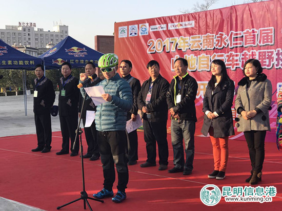 昆明信息港讯 记者任骥远 2月12日上午,2017年中国永仁首届“阳光城杯”山地自行车越野挑战赛在楚雄彝族自治州永仁县赛装广场举行。作为七彩云南2017民族赛装文化节启动仪式暨中国·永仁直苴彝族赛装节系列活动的一个重要组成部分,本次挑战赛吸引了98名运动员参加。