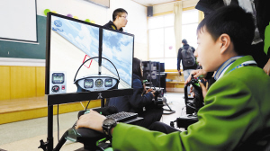 左手控制油门,用力向上推进,飞机开始加速,并逐渐飞离地面;空中,右手操控着方向,驾驶飞机避开各种障碍物,完成计算机给予的任务、目标……模拟飞行器上,学生乐不思蜀。第一次模拟飞行,新闻路小学6年级2班的李金泽就飞到了第三关,他说:“平常接触较多的是无人机,感觉模拟飞行比操作无人机难多了。我最大的梦想是翱翔在祖国的蓝天上。”