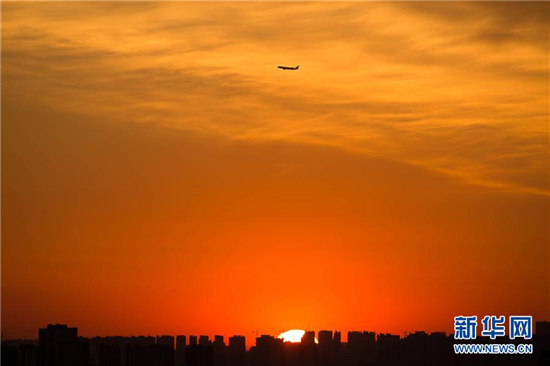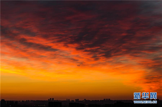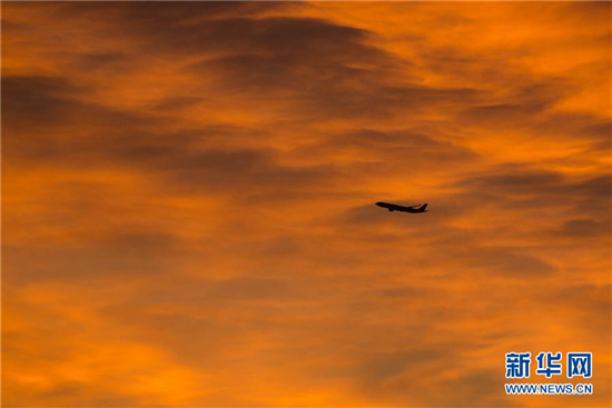 2月20日清晨,一架飞机在北京上空飞行。当日,北京天气晴好,天空出现漂亮朝霞。新华社发(李建波 摄)