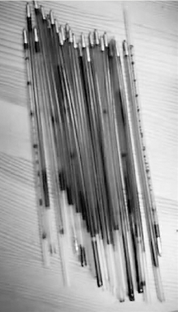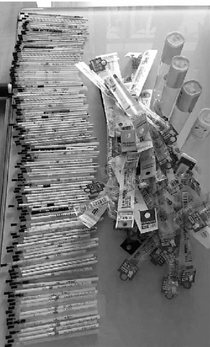 第一张笔芯照片(上图)的主人,是杭州文晖中学初一英语老师占卫兰,都是红色的圆珠笔笔芯,主要用于批改作业。一共25根,用完花了一学期。