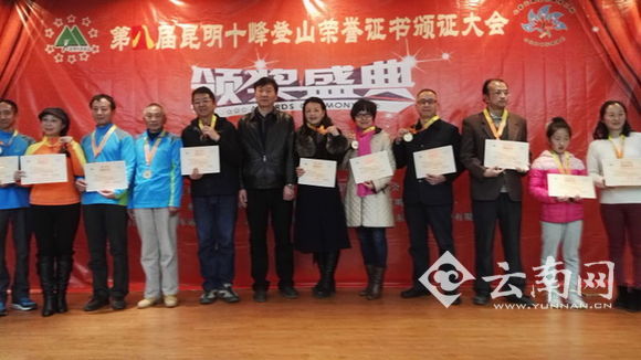 昆明市体育总会秘书长何伟翔宣读了本届十峰攀登完成者名单,随后省体育局、市文化广播电视体育局、市体育总会、市委统战部、致公党昆明市委等单位领导为十峰攀登完成者、特别人物与单位颁发了荣誉证书。