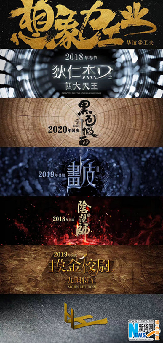 从2006年《天下无贼》到2015年的《鬼吹灯之寻龙诀》,华谊兄弟与陈国富及工夫影业一起打造了诸多如《狄仁杰》、《太极》、《寻龙诀》等极具开创意义的系列电影,此次两家公司联手发布“想象力工业”电影计划,以“金木水火土”五行元素为主题,提前三年全部定档。其中:“狄仁杰”系列第三部《狄仁杰之四大天王》定档于2018年春节上映;根据同名手游改编的电影《阴阳师》定档于2018年国庆上映;华语东方新魔幻经典“画皮”系列第三部《画皮前传》定档于2019年暑假上映;根据天下霸唱原著改编的盗墓经典《摸金校尉之九幽将军》将于2019年国庆上映;根据世界电影大师黑泽明遗作剧本改编的《黑色假面》将于2020年国庆上映。‘