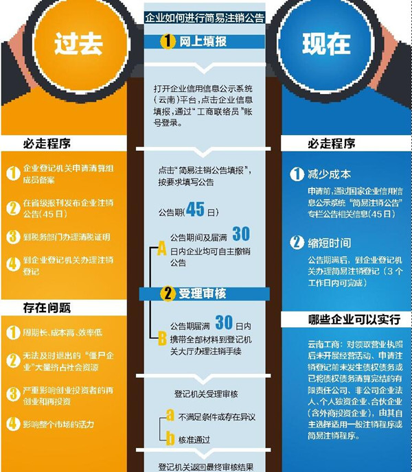 昆明信息港·都市时报 记者吴双红 昨日起,《云南省企业简易注销登记暂行规定》(以下简称《规定》)正式施行,有效期到2020年3月7日。《规定》共18大条,明确了适用范围、双方职责等。云南省工商局、昆明市工商局对《规定》做了详细解读。