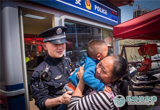 3月16日是海源寺的赶集日,五华分局海源派出所民警王钦臣照例在人流量几近十万人次的集市巡逻,过程中发现一小男孩儿哭闹,现场询问周边群众,无人认识。看见陌生人靠近,小朋友越发哭的厉害。王钦臣和同事们为了安抚小朋友情绪,买来棒棒糖、酸奶等小食品,还扮演起灰太狼,终于小朋友破涕为笑,只言片语给民警提供了父母的有效信息,王钦臣抱着小男孩回到警务亭。