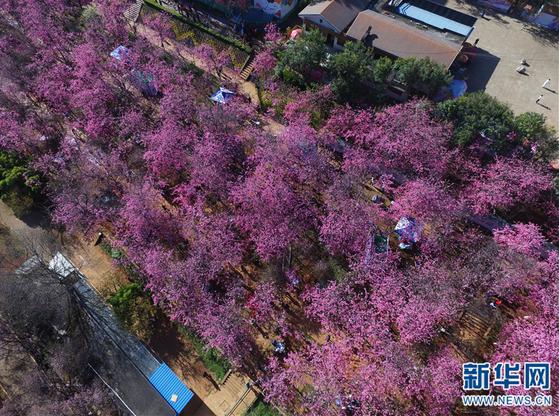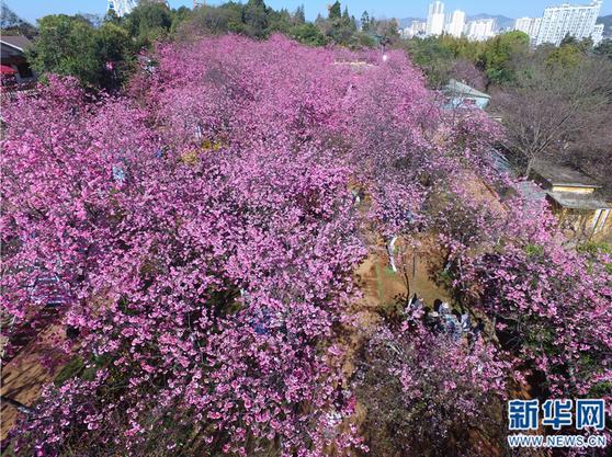 航拍昆明圆通山樱花潮 灿若云霞春色如画