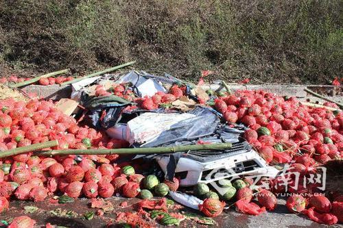 云南一新车违规变道酿车祸 交警30吨西瓜里刨出3人