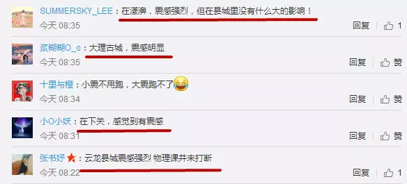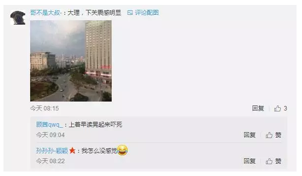 地震同时,当地人朋友圈也地震了,洱源、西山、凤羽、三营、牛街等地网友纷纷表示有强烈震感。不过各地网友感觉到的震感不一样。