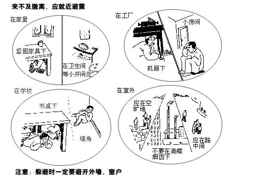 破坏性地震从人感觉振动到建筑物被破坏平均只有12秒钟,在这短短的时间内你千万不要惊慌,应根据所处环境迅速作出保障安全的抉择。如果住的是平房,那么你可以迅速跑到门外。如果住的是楼房,千万不要跳楼,应立即切断电闸,关掉煤气,暂避到洗手间等跨度小的地方,或是桌子,床铺等下面,震后迅速撤离,以防强余震。