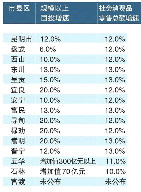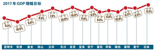 保持经济平稳增长是2017年昆明市经济社会发展的首要目标,昆明市将GDP的增长目标定在了9%,而昆明十四个县市区中,官渡、呈贡、东川、禄劝四个县区的2017经济社会发展目标中,把GDP增速定在了10%,6个县区将增速定在9%,3个县区增速定位8.5%,仅有五华区将GDP增速定在7%。