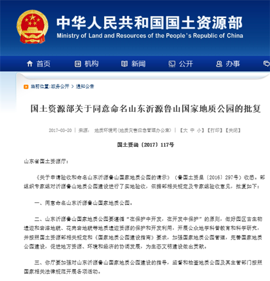 近日,记者从国土资源部网站了解到,沂源鲁山国家地质公园命名正式通过批复,这是淄博市首家被国土资源部命名的国家地质公园。