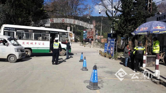 昆明交警截停涉嫌“脱检”的城乡公交车。