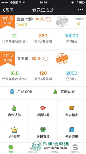 目前“云农生活会”提供多种类型的认养产品,用户最低支付认养金额2000元,就能拥有一头属于自己的“仔猪”。经历4-12个月养殖周期后猪出栏,用户可选择自行消费生猪或平台代售,平台代售的年化收益率最高为12%。用户如果选择自行消费,平台也能提供猪的屠宰、加工等服务,满足对食材要求严苛的专业吃货、看重长远收益的资深投资人等的不同需求。