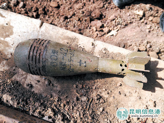 昆明信息港·都市时报 首席记者程浩 5日下午4点多,楚雄市公安局开发区派出所接到报警称,有群众在开发区烟草公司后面的施工工地里发现一枚炮弹。
