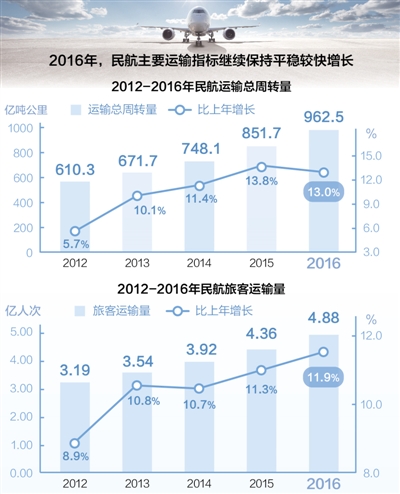 同时,我国民航运输效率也在提升。2016年,正班客座率平均为82.6%,比上年提高0.5个百分点。“从国际上来看,80%以上的客座率就已经比较高了,我国能达到这一水平也说明民航客运市场需求的旺盛。”