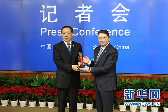 国家旅游局局长李金早向联合国世界旅游组织秘书长瑞法依赠送礼物。新华网 薛枫/摄