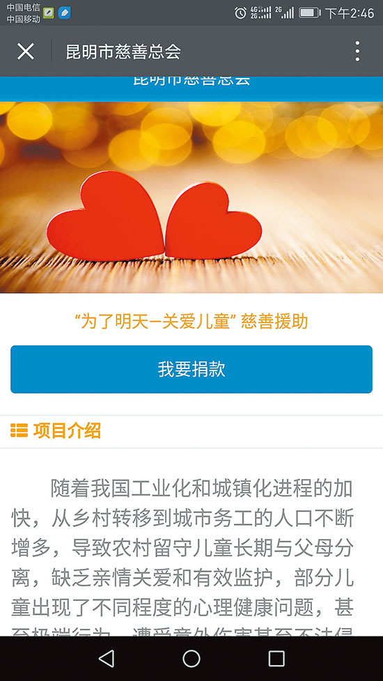 2、点击“我要捐款”,选择“为了明天—关爱儿童”慈善援助