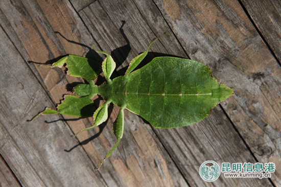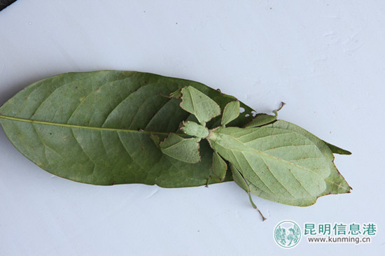 蒋先生再一细看,才发现这片“树叶”并不简单,竟然还有头有脚,枝节分明,在地上来回爬动。细看虫体,近10公分长、5公分宽的虫体上面有着非常清晰的“叶片脉络”,正面看上去像树叶的灰白色“背面”,虫体翻转时看到的绿色又不一样,似树叶的翠绿“正面”。单看虫身部分几乎与绿树叶无异,活脱脱一片“会走路的树叶”。而且这只“叶子虫”的翅部是由上下两片“叶子”组成,在下的树叶脉络明显更粗壮许多,是虫的身子部分。另外,这只虫子的手脚极为独特,酷似被残食的不规则叶片,与平常见到的虫类大不相同。最终,这个“不速之客”被普洱小熊猫庄园的工作人员放归自然。