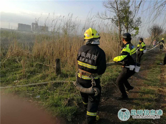 昆明信息港讯 记者合宇聪 5月26日下午6时前后,昆明市环湖东路福保渔港旁边的干芦苇林着火,现场一时浓烟滚滚形势危急。