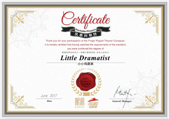 此外,参加必胜客指偶视频分享活动的亲子家庭,将有机会获得阿歇特和必胜客联合发布的“小小戏剧家”证书。您可以将表演视频上传到新浪微博,加话题榜#必胜客指偶小剧场#,同时@必胜客欢乐餐厅 @凤凰阿歇特,分享独一无二的指偶戏剧体验!(具体活动规则详见必胜客欢乐餐厅官方微博活动通知)