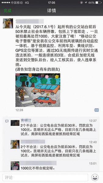 可以看出,微信传播的消息中,对公交站台前后“控制区域”描述发生错误,不是50米,而应该是30米。此外,对被抓拍最高处罚1000元的金额,也报道有误。根据《交通法》规定,昆明对抓拍到的占用公交专用道、占用公交车停靠站违法停车的,处罚标准与《交通法》一致。