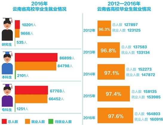 云南高校毕业生的就业情况如何?哪些高校的专业就业率达100%?……日前,省教育厅权威发布《云南省2016年高校毕业生就业质量年度报告》指出,2016年,云南省66所高校和6所科研单位共有毕业生164803人,截至当年底有160916人就业,就业率达97.6%。其中,在昆明就业人数占毕业生总数的41.95%。